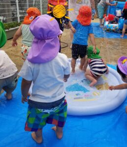 そして園庭に移動した後、先生がかき氷を作って子どもたちに