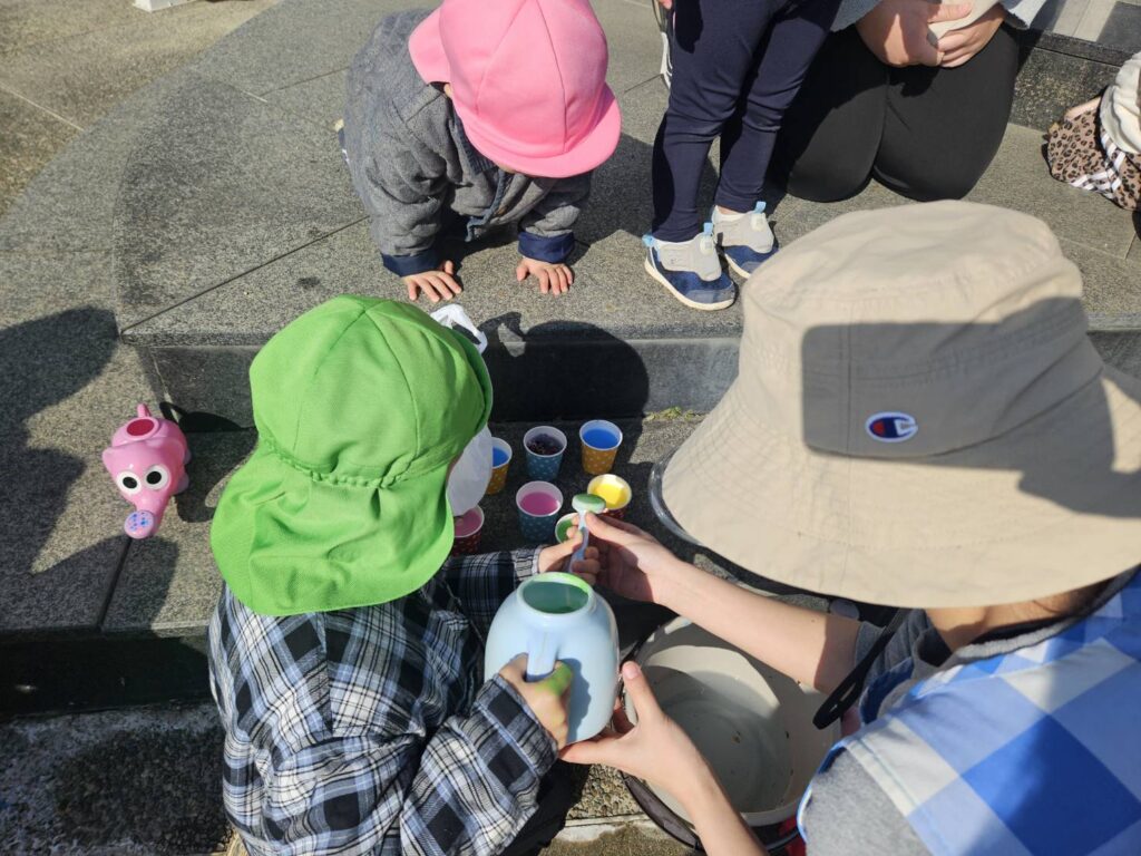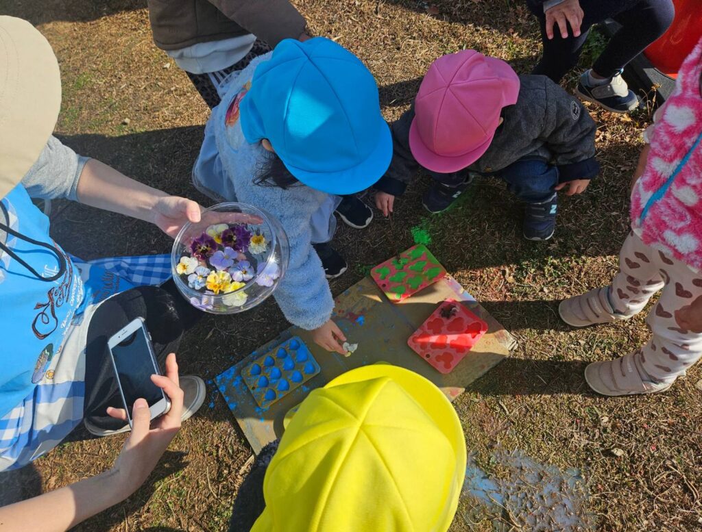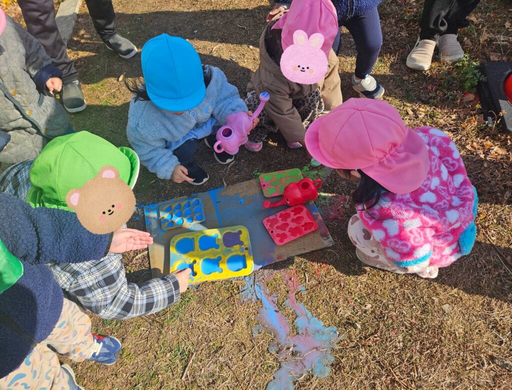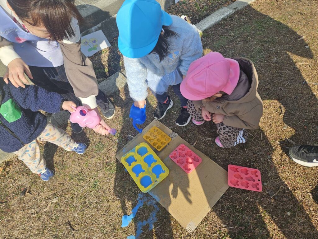 珍しく雪が降りました☃とっても寒かったので、【こおりづくり】に挑戦しました😊いろみずと花びらで美味しそうなアイスクリームができました♡