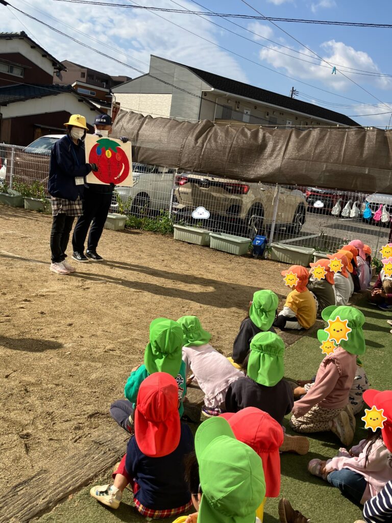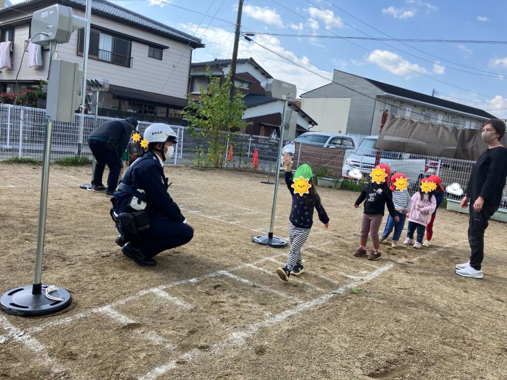 11/10 交通安全教室がありました。信号の見方を教えてもらい実際に信号機を見て横断歩道を渡りました。『右を見て・左を見て・もう一度右を見て!』車がきてないことを確認できたら手を挙げてと、ひとりひとりが真剣な表情で取り組んでいました。